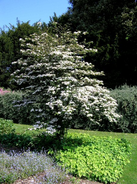 A small-medium compact (3m x 2m) fully hardy shrub with white flowers, turning pink, in late spring followed by clusters of small pink berries.