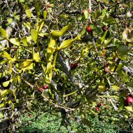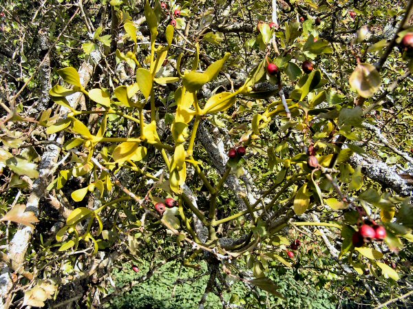 The only Mistletoe species native in Great Britain and much of Europe it is readily recognized by its smooth-edged oval evergreen leaves borne in pairs along the woody stem, and waxy white berries in dense clusters of 2 to 6. Often difficult to see when the trees are in full foliage it can be readily appreciated during the winter months.