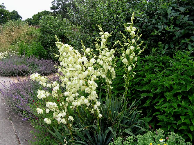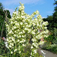 A stemless evergreen shrub forming clumps of sword-shaped, deep green leaves upto 75cm in length, edged with curly filaments. Nodding creamy-white flowers 6cm in length are borne in panicles to 2m in height in summer