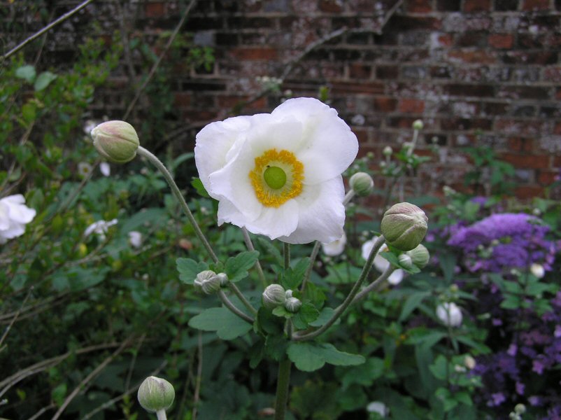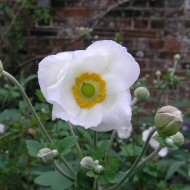 This Japanese anemone is a vigorous clump forming hardy perennial (120cm x 120cm) that flowers from August to October with pure white flowers and robust foliage of deeply-divided, slightly-bristled, dark-green leaves. that surround small, yellow disk flowers. The papery bracts last indefinitely when dried. Lance-shaped, white, woolly leaves turn green as they age, with white, woolly hairs underneath. Native to North America