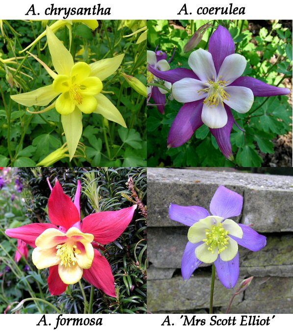 Clump-forming hardy herbaceous perennial with long-stalked, divided basal leaves and erect, leafy stems bearing bell-shaped flowers with spreading, coloured sepals and petals with spurs, on branched stems. The colloquial name Grannies Bonnet refers to our native British aquilegia whereas the varieties here are native of the North American mid-west through to the Rocky Mountains. Depicted above are the four main groups but they have readily hybridised to create multiple variations.