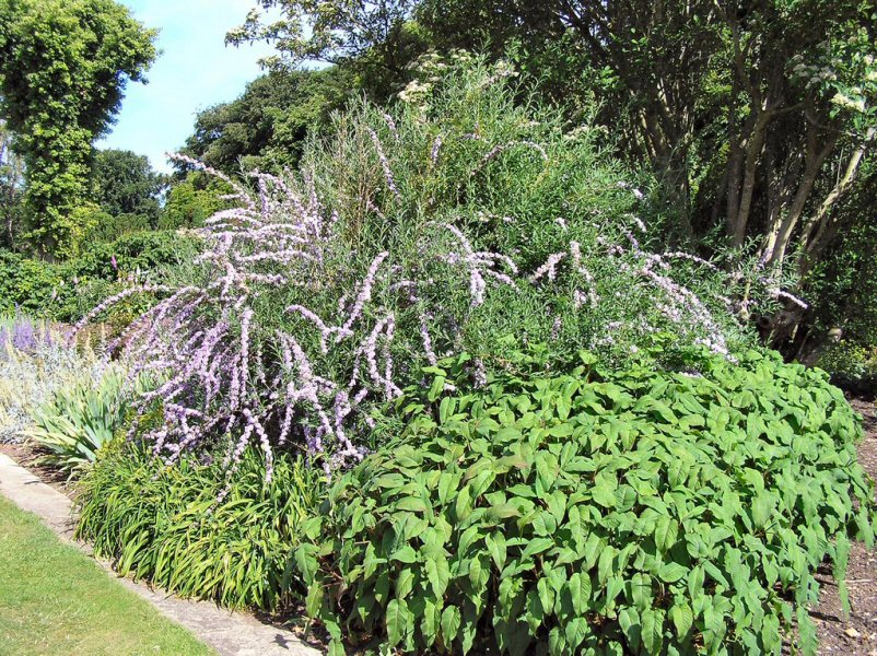 A hardy deciduous shrub, 3m (10ft) high by 6m (20ft) wide, with long arching branches, native to China. Narrow lanceolate pale green leaves and lavender-blue flowers borne in rounded clusters on the previous year's growth in June. Grown here as a standard it can be seen growing naturally near The Temple.