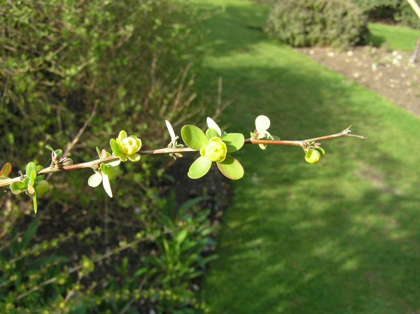 A small wide (h 1.2m x s 1.5m) fully hardy evergreen shrub with yellow flowers in late Spring and early Summer native to China. Slow growing the flowers are bowl shaped and the fruit is purple.