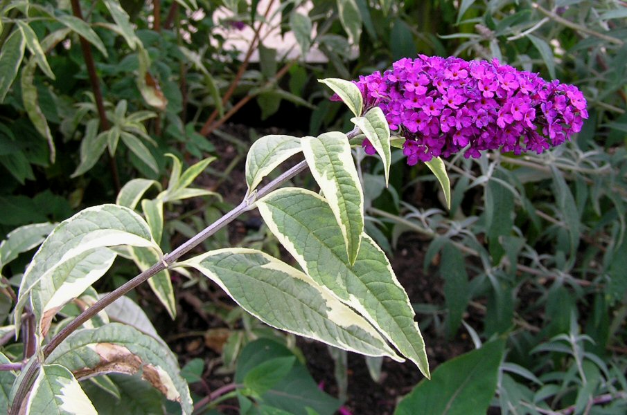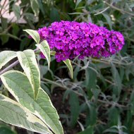 A hardy, compact, bushy, deciduous shrub with narrow, grey-green and cream or yellow, variegated leaves and long panicles of reddish-purple flowers from summer into autumn.