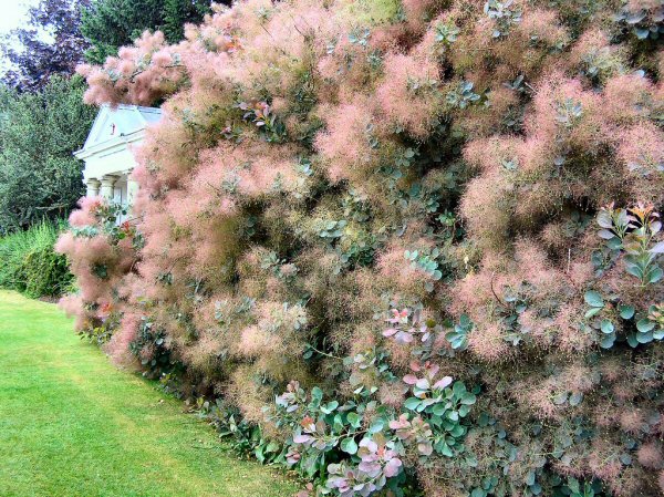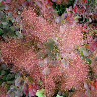 A deciduous spreading, open hardy shrub with rounded or oval light green or purplish-red leaves, H: 5m S: 5m (15ft x 15ft). Masses of tiny flower stalks form showy, pale, plume like clusters which give it its smoke like appearance. Both the green and purple varieties grow here close together. Native to southern Europe and central China.