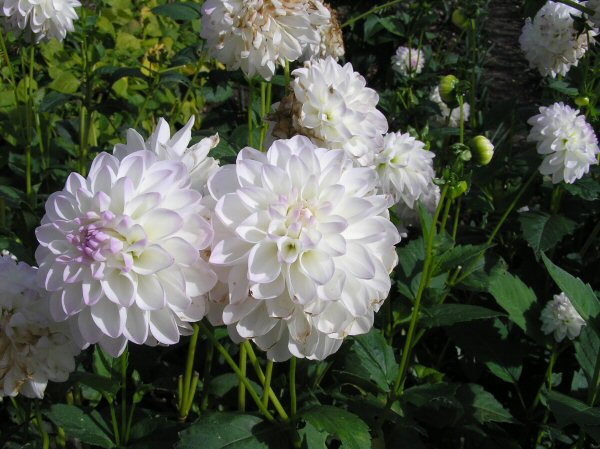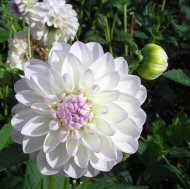 Pompon type with neat white flowers edged and delicately suffused in lilac-purple.