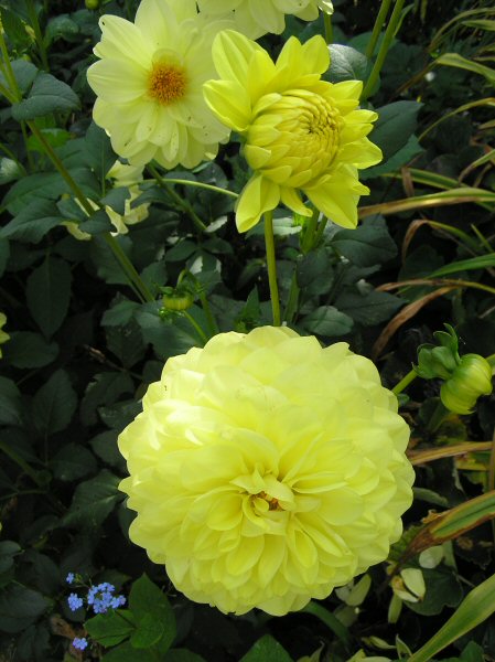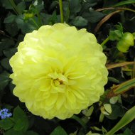 Upright, bushy, clump-forming dahlia with pinnate, toothed, dark green leaves and strong stems bearing fully double, lemon-yellow flowers in summer and autumn.