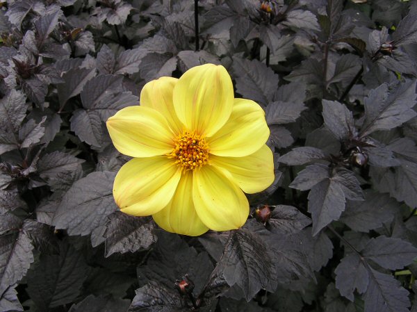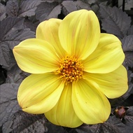 'Yellow Hammer' is a single-flowered, Lilliput dahlia with a dwarf habit. Its divided foliage is bronze. In summer and autumn it bears single, pale-yellow flowers with bronze-based florets