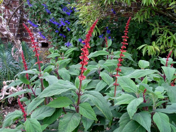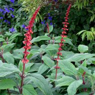 A half-hardy shrubby perennial up to about 1m best in its second or third year. The small red flowers form in a narrow spire and are held close to the stem with the calyces of each flower and the flower stems being fuzzy crimson.