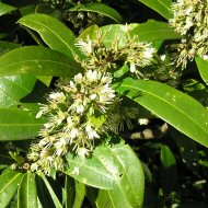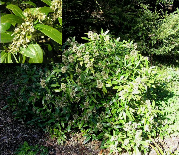 A hardy evergreen shrub up to 1m native to the Himalayas and the Far East. Most are dioecious, meaning they have male and female flowers on different plants, and both sexes must be planted to ensure a crop of fruits. The flower buds, which appear in autumn and winter, are a prominent feature of the plant, as are the scented yellow cream flowers flowers which open in late winter. Kew Green' is a smal shrub with aromatic, broadly oblong leaves to 12cm in length and large clusters of small, fragrant greenish-yellow flowers in spring.
