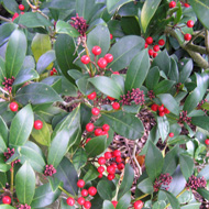 A hardy evergreen shrub up to 1m native to the Himalayas and the Far East. Most are dioecious, meaning they have male and female flowers on different plants, and both sexes must be planted to ensure a crop of fruits. The flower buds, which appear in autumn and winter, are a prominent feature of the plant, as are the scented yellow cream flowers flowers which open in late winter. It is perfect for growing in containers and provides good all year round colour with red berries through autumn.