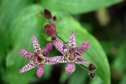 Pronounced tri-SIR-tiss. A clump-forming hardy perennial of the lily family with an upright, spreading habit. H: 80cm S: 60cm (3ft x 2ft), native from the Himalayas to Japan, grown for exotic-looking, speckled, waxy textured flowers produced in late summer and autumn.