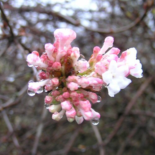 A hardy medium to large, 3m x 2m (10' x 6') deciduous shrub with burnished bronze foliage in autumn and dense clusters of sweetly scented, rose-tinted flowers often from late autumn into early spring. A cross of Viburnum farreri (formerly V. fragrans) and V. grandiflorum was done at Bodnant, hence the derivation of the name