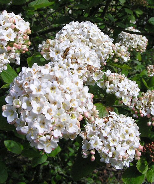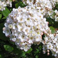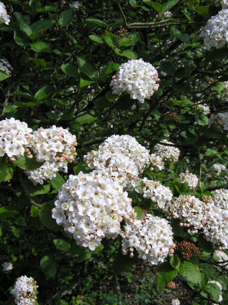 A hardy medium-large (2m x 2m) dense bushy deciduous shrub with ovate, irregularly toothed, dark-green leaves to 10cm (4in) long, often turning red in autumn. Exceptionally fragrant flowers 1cm (½in) across in domed, terminal corymbs to 8cm (3in) across followed by ellipsoid, red fruits 6mm (¼in) long, ripening to black.