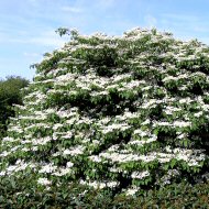 A large (3 - 4m), hardy, deciduous shrub with wide-spreading, tiered branches and prominently veined, dark green, ovate leaves, purple in autumn. Large lacecap heads of white flowers in late spring are occasionally followed by red, later black fruit