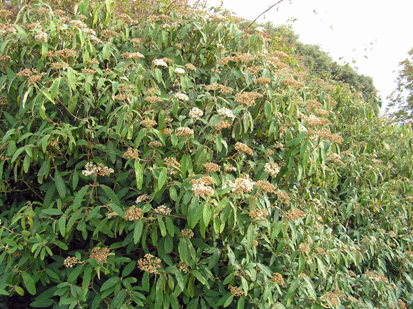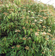 An evergreen shrub with long, medium green leaves grwoing to 2 - 3m in height. White flowers appear in spring followed by attractive red fruit in the autumn which gradually turns to shiny black, adding colour and interest to the garden throughout the year.